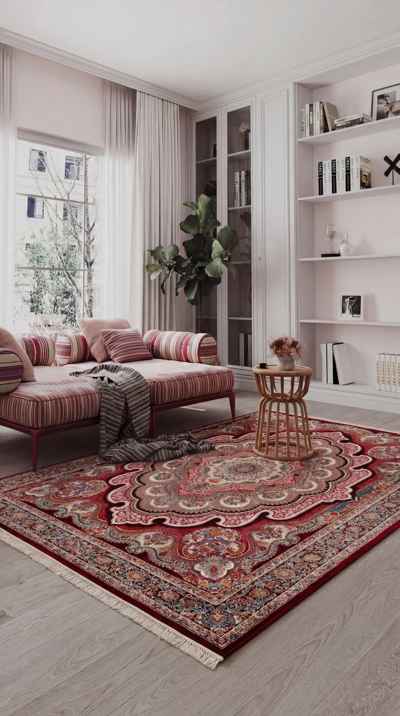 The elegant "Aryan" oriental rug comes in a sophisticated dark red and is available as a runner and rectangular rug. This rug combines traditional patterns with timeless elegance and creates an ambience full of luxury. The detailed workmanship makes "Aryan" the perfect choice for the living room, bedroom or hallway. Made from hard-wearing materials, this rug offers durability and comfort. Ideal for lovers of classic oriental rugs who value style. With "Aryan", you can give your rooms an exclusive touch.